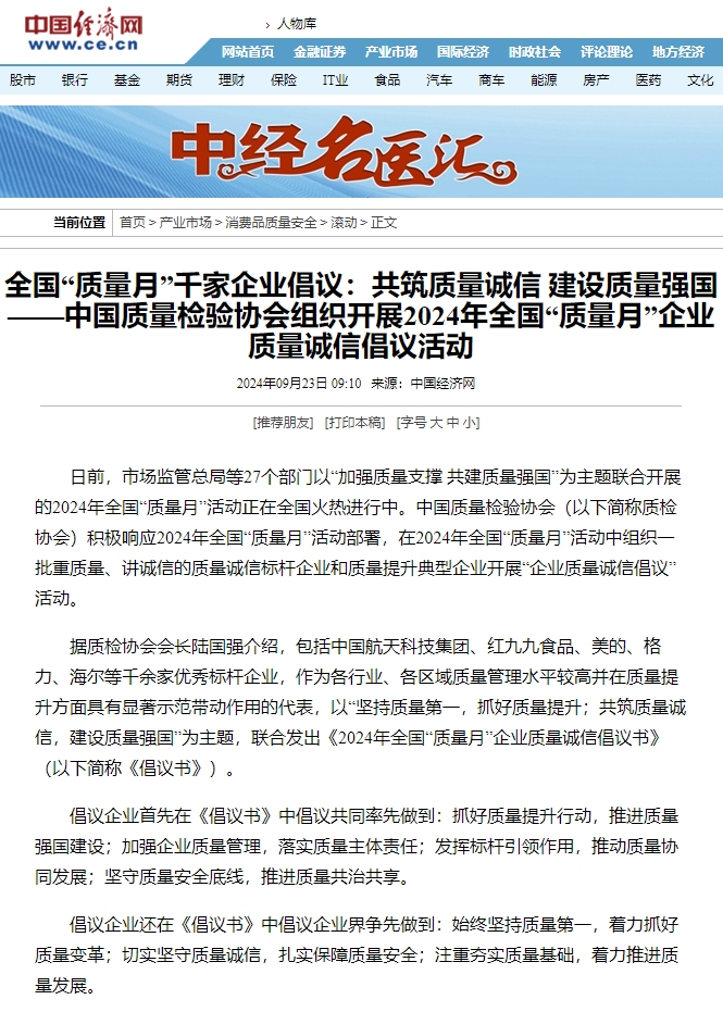 每年9月是全國“質量月”,由市場監管總局等27個部門以“加強質量支撐 共建質量強國”為主題,聯合開展的“質量月”活動。在2024年全國“質量月”活動中組織一批重質量、講誠信的質量誠信標桿企業和質量提升典型企業開展“企業質量誠信倡議”活動。 其中,包括重慶紅九九食品等千余家優秀標桿企業,以“堅持質量第一,抓好質量提升;共筑質量誠信,建設質量強國”為主題,聯合發出《2024年全國“質量月”企業質量誠信倡議書》(以下簡稱《倡議書》)。 倡議企業首先在《倡議書》中倡議共同率先做到:抓好質量提升行動,推進質量強國建設;加強企業質量管理,落實質量主體責任;發揮標桿引領作用,推動質量協同發展;堅守質量安全底線,推進質量共治共享。 倡議企業還在《倡議書》中倡議企業界爭先做到:始終堅持質量第一,著力抓好質量變革;切實堅守質量誠信,扎實保障質量安全;注重夯實質量基礎,著力推進質量發展。 倡議企業同時在《倡議書》中倡議全社會努力做到:共同筑牢質量誠信,助推中國質量發展;發揮質量社會共治,唱響中國質量精神;推進建設質量強國,共創中國質量輝煌。 (中國經濟網報道)